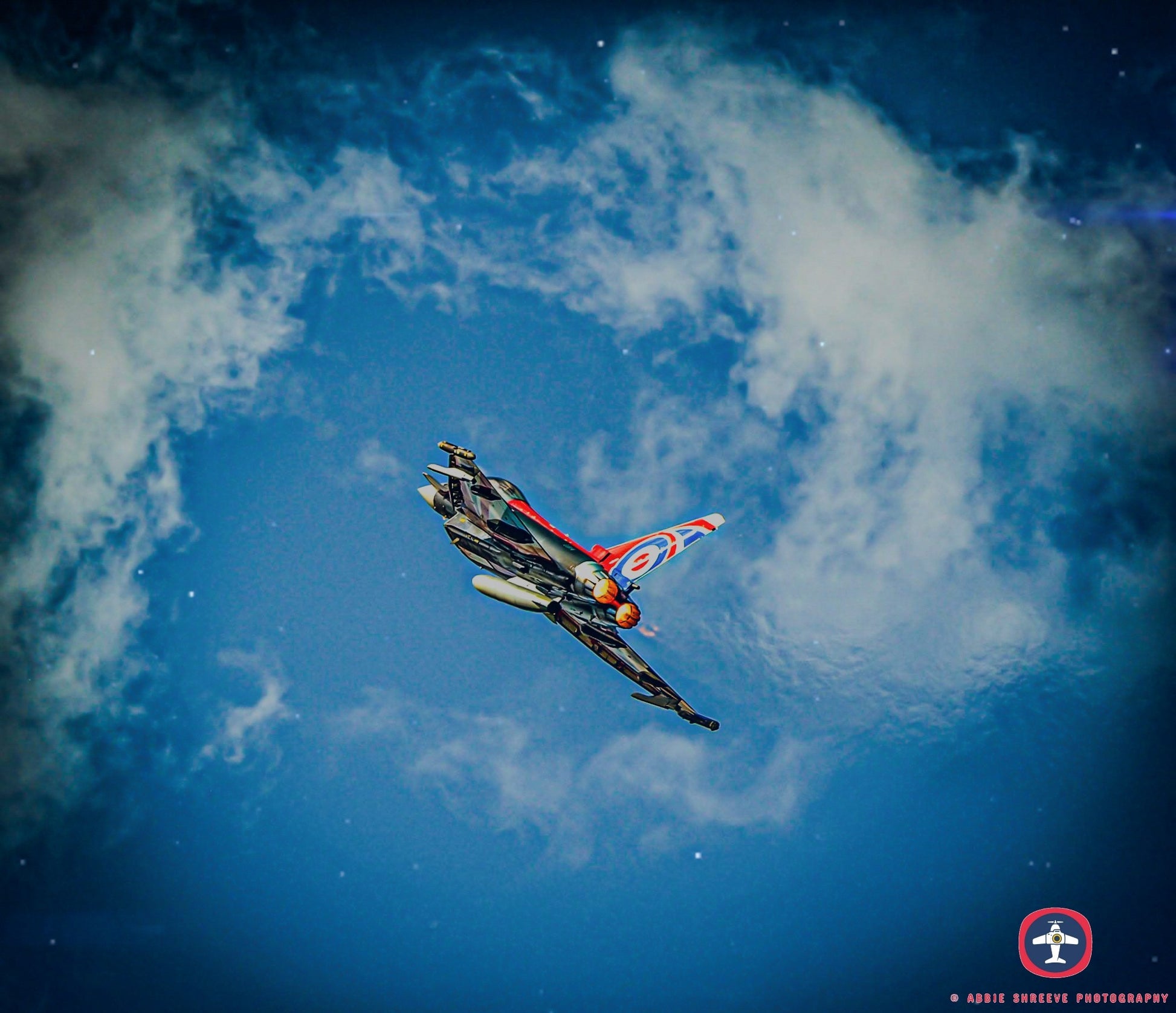 Typhoon flying amongst the clouds showing off its union jack colour scheme.